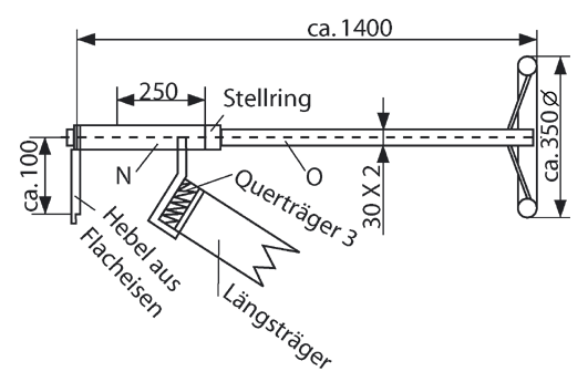 Wir verwenden eine direkte Steuerung, die aus einem Stahlrohr besteht (Abb. 15), an dessen oberem Ende ein Steuerrad, das wir uns alt beschaffen, befestigt wird. Das Stahlrohr erhält an seinem unteren Ende einen Hebel aus Flacheisen, den wir anschweißen lassen. An diesen Hebel schließen wir dann eine Zugstange S (Abb. 8) an, die mit dem Lenkhebel L des Steuerschenkels T in Verbindung steht, während die Lenkhebel der beiden Steuerschenkel untereinander ebenfalls durch eine Stange, Spurstange bezeichnet, verbunden sind. Das Stahlrohr O der Steuerung (Abb. 15) wird in dem zweiten Stahlrohr N, das genau über das erste passt, gelagert. Die Befestigung des Stahlrohres N geschieht an dem Querträger 3 mit einem Flacheisen, das an das Rohr angeschweißt wird.