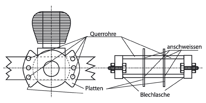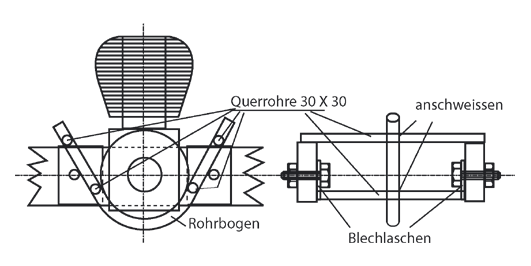 Handelt es sich jedoch um einen Motor für einen so genannten offenen Rahmen, bei dem der Einbau durch Platten, die an die Rahmenrohre angeschweißt sind, erfolgt, so verwenden wir die selben Platten, durchbohren sie und schieben durch die vorderen zwei und durch die hinteren zwei Platten je ein starkwandiges Stahlrohr hindurch.